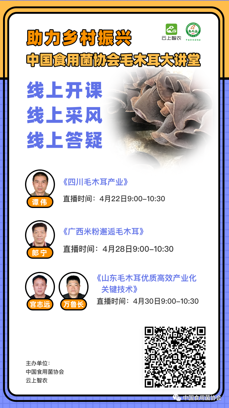 4月30日,中国食用菌协会常务理事、山东省食用菌协会会长、国家食用菌产业技术体系岗位专家宫志远和中国食用菌协会常务理事、山东省食用菌协会副会长、山东省农业科学院农业资源与环境研究所研究员万鲁长将为大家分享《山东毛木耳优质高效产业化关键技术》,大家在直播间就能领略到山东省济宁市鱼台县毛木耳产业的风采。